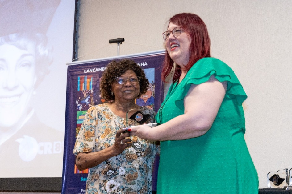 Ursulina Teodora recebe prêmio da presidenta Ana Cláudia Martins. Foto: Arquivo do CRB-8/Divulgação.