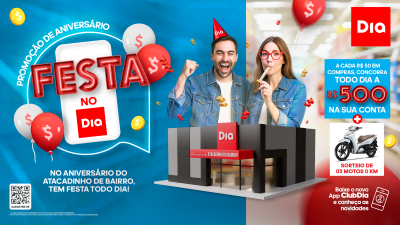 São Paulo -SP, 2 de outubro de 2025 - O Dia Supermercado, uma das principais redes de varejo alimentar do Estado de São Paulo e referência no conceito ‘Atacadinho de Bairro’, comemora seus 24 anos neste mês de outubro com uma ampla campanha que promete movimentar todas as lojas com prêmios aos clientes. A campanha “Festa no DIA”, vai transformar todo o mês de outubro em um verdadeiro festival de prêmios e ofertas. A cada R$ 50,00 em compras, o consumidor concorre diariamente a R$ 500,00 depositados diretamente no PicPay, e ainda a 3 motos 0KM, em sorteios oficiais realizados pela Loteria Federal. Para participar, o cliente deve ser cadastrado no Club Dia e se cadastrar no site da promoção - link (aqui) -, onde também terá acesso ao regulamento e demais informações da campanha. Além da premiação, a rede preparou ofertas exclusivas em todas as lojas, espalhadas pela capital, litoral e interior paulista, reforçando o compromisso de estar próxima dos clientes, oferecendo qualidade e economia. Com o mote "Festa no DIA”, a proposta criativa da campanha reforça o vínculo do DIA Supermercados com seu público: uma marca acessível, presente no dia a dia e conectada às necessidades reais dos consumidores. “Queremos celebrar este marco ao lado de quem fez parte dessa trajetória: os nossos clientes. Por isso, criamos uma campanha que oferece chances reais de ganhar prêmios", afirma Fabio Farina, CEO do DIA Supermercados. A estratégia de comunicação contempla todos os pontos de contato da marca, com forte presença em TV, rádios, mídias digitais, OOH, redes sociais e materiais nas lojas. A campanha tem criação e mídia da agência FourHands.