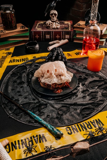 Entre as opções do cardápio sazonal, estão as Múmias (R$ 26), salsicha artesanal envolta em folha de arroz com rúcula e molho barbecue, e o Poltergeist (R$ 49,90), salada de alface frisée com pesto, tomate cereja, tomate carmen, azeitonas pretas e muçarela de búfala. Nos principais, o Casper (R$ 52,90) traz hambúrguer no pão brioche com pulled pork, coleslaw, molho barbecue e folha de arroz; já o Slimer (R$ 59,90) é um risoto de abóbora cabotiá com redução de balsâmico e azeitona preta. Para encerrar, a sobremesa Cova (R$ 31,90) combina brownie com sorvete de chocolate, cobertura de pistache e crumble de chocolate.