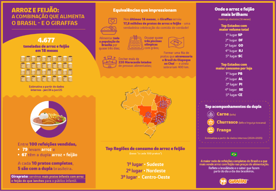 Entre janeiro de 2024 e junho de 2025, a rede serviu mais de 17 milhões de pratos de arroz e feijão, somando 4.677 toneladas. O volume seria suficiente para alimentar toda a população de Brasília por quase três dias - um dado que reforça o protagonismo da dupla, mas também o papel do Giraffas como guardião da comida de verdade nas praças de alimentação.
