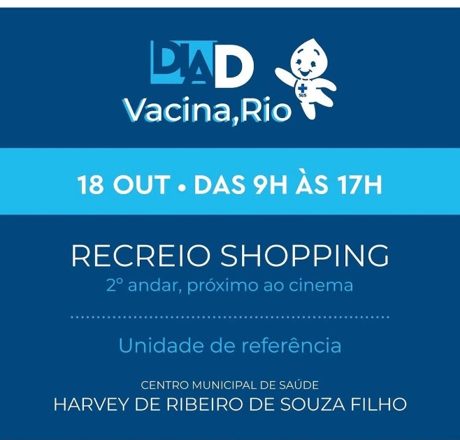 O Recreio Shopping promove no dia 18 de outubro, sábado, o Dia D de Vacinação, das 8h às 17h, no 2º piso, ao lado do cinema. A iniciativa é voltada para crianças e adolescentes e oferece mais de 16 tipos de vacinas para atualizar a caderneta de vacinação e proteger contra diversas doenças.